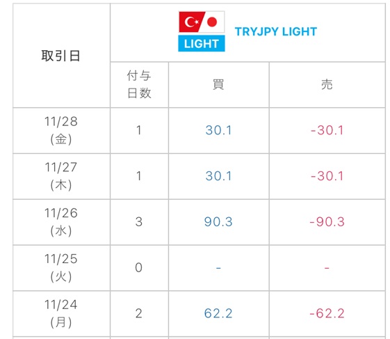 11月24~28日:10,635 円 X Facebook はてブ LINE Pinterest コピー 2025.11.292026.01.10 目次 週間スワップ:10,705 円評価損益:100,825円稼ぐ方法は 週間スワップ:10,705 円 月曜日に2日分となったので、火曜日は0円でした。 24 (月)25 (火)26 (水)27 (木)28 (金)3,110 円0 円4,515 円1,505 円1,505 円 評価損益:100,825円 ・少し円高方向へ動き、評価益が 64,000円となりました。・累計スワップは、11月1~28日となり、11月分が確定しました。 本日 01月10日(土) の評価損益合計はこちら➡ 稼ぐ方法は ポジションを保有しているだけ。詳しくはこちら➡
