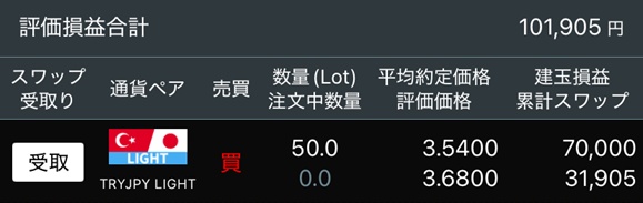 12月15~19日:10,335 円 X Facebook はてブ LINE Pinterest コピー 2025.12.202026.01.10 目次 週間スワップ:10,335 円評価損益:101,905円稼ぐ方法は 週間スワップ:10,335 円 水曜日以降の5日分が、30円を割り込んできました。 15 (月)16 (火)17 (水)18 (木)19 (金)1,555 円1,505 円4,365 円1,455 円1,455 円 評価損益:101,905円 ・円安方向に振れたので、建玉損益が 70,000円となりました。・累計スワップは、12月1日からの3週分となっています。 本日 03月07日(土) の評価損益合計はこちら➡ 稼ぐ方法は ポジションを保有しているだけ。詳しくはこちら➡