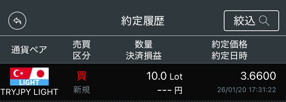 10ロット追加 X Facebook はてブ LINE Pinterest コピー 2026.01.202026.02.14 目次 保有を60ロットに10ロット:3.66円で約定 保有を60ロットに スワップが30円/ロットを下回ってきたので、10ロットを追加。 10ロット:3.66円で約定 平均約定価格が、3.54円から 3.56円になりました。 1月20日より、スワップが2割のアップになります。