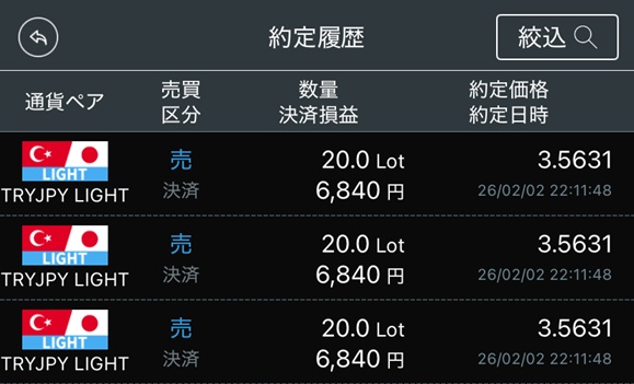 ノーポジションに X Facebook はてブ LINE Pinterest コピー 2026.02.03 全ロット売り 売値 3.5631円 で全ロット売りました。約2週間分のスワップ相当額 20,520円の利益確定となっています。 • 値動きが激しいので、しばらく様子見とします。• 買指値 3.50円で、注文は入れておきます。